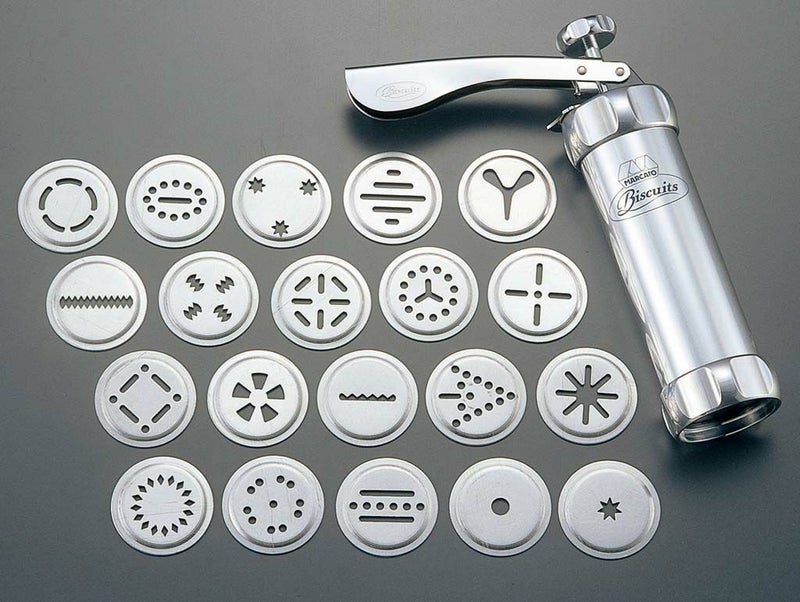 ●全て金属製で、高品質のビスケットメーカーです。使い方が簡単で、取り付けノズルが20種類あります。