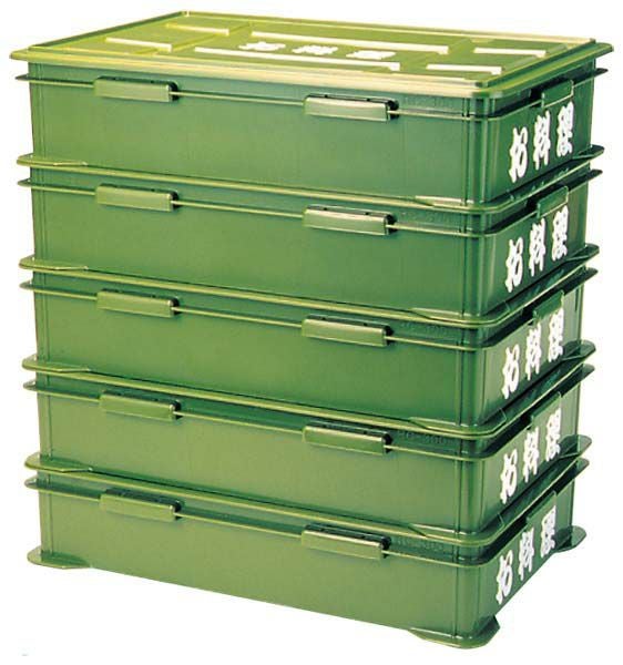 ●どこからでも握れるように全ての面に把手をつけました。積み重ね可能で、ずれ落ちたりせず収納に便利です。内部底面にスベリ止めがついております。