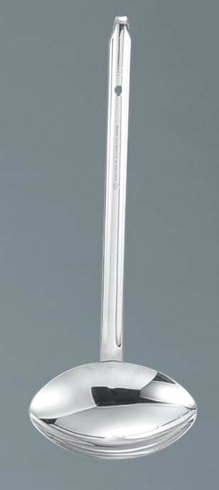 ●皿部外周面に添わせた把手先部と皿部とを、スポット溶接で連結すると共に蝋付けによって両者の隙間を密封したレードルです。充分な強度を備えると共に、食品かすが残らず雑菌類の付着を防ぎ、しかも洗いやすく衛生的なレードルです。