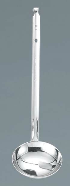 ●皿部外周面に添わせた把手先部と皿部とを、スポット溶接で連結すると共に蝋付けによって両者の隙間を密封したレードルです。充分な強度を備えると共に、食品かすが残らず雑菌類の付着を防ぎ、しかも洗いやすく衛生的なレードルです。