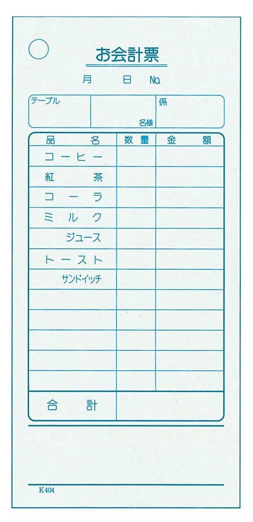単式 会計伝票 K404(100枚つづり・20冊入)コーヒー 業務用 8566600 【メーカー取寄せ】