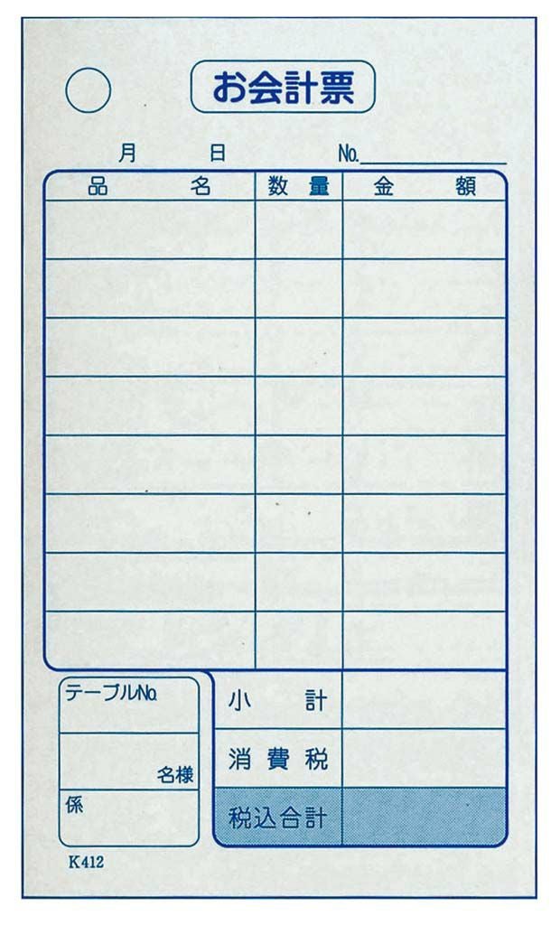 単式 会計伝票 K412(100枚つづり20冊入)消費税対応 業務用 8567400 【メーカー取寄せ】