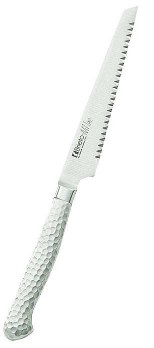 ●ハンドル部:18-8ステンレススチールモナカハンドル。ガラスビーズショット仕上げによる、手触りのソフト化、滑り防止。刃部とハンドル部の(溶接による)一体化で、雑菌等の付着防止など、従来の木ハンドルの衛生面での問題を克服しました。(手研本刃付)